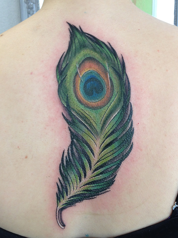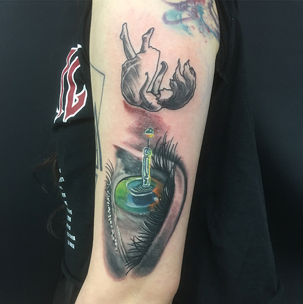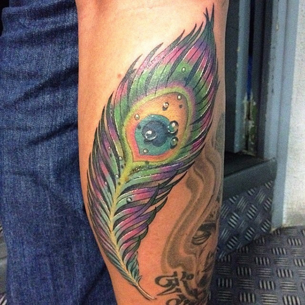 Water drops on peacock feathersリアリスティックスタイルの目と落ちる少女