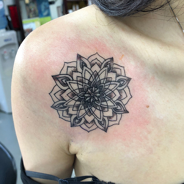 Color henna tattoo菊と梟、朝顔と鶏