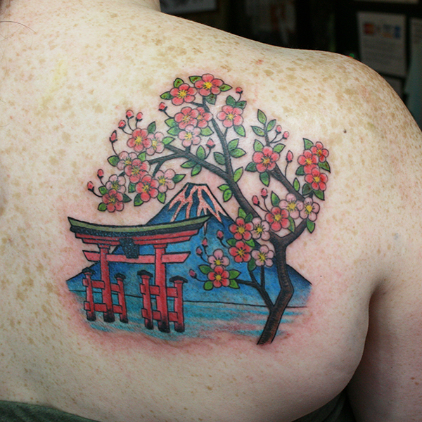 Polynesian-style tattoo. freehand桜と鳥居と富士
