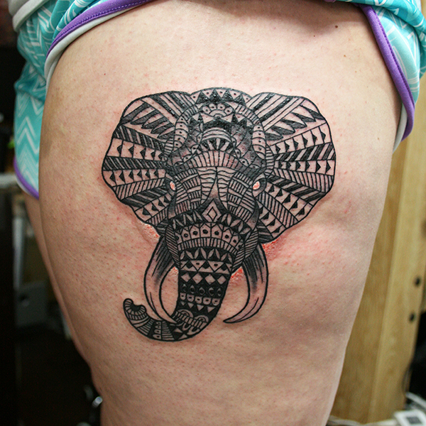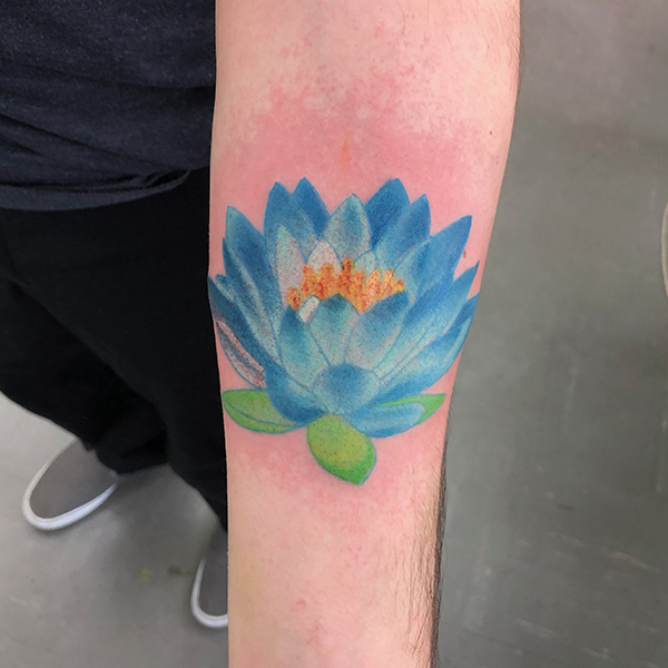 Colorful Shi-sa tattoo on Thigh観音と蓮