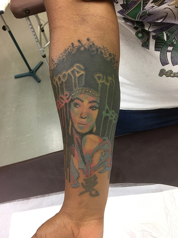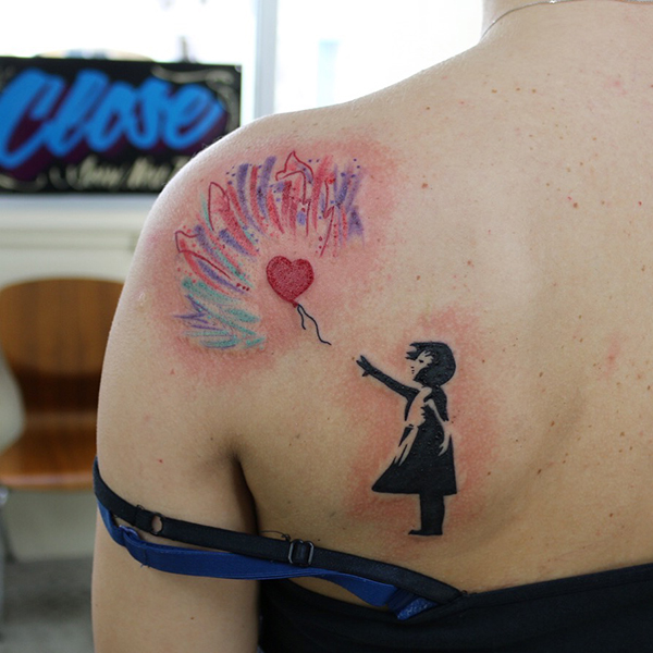 Girl of Banksy and watercolor-styleバイオオーガニックスタイルの内側に宇宙、カバーアップタトゥー