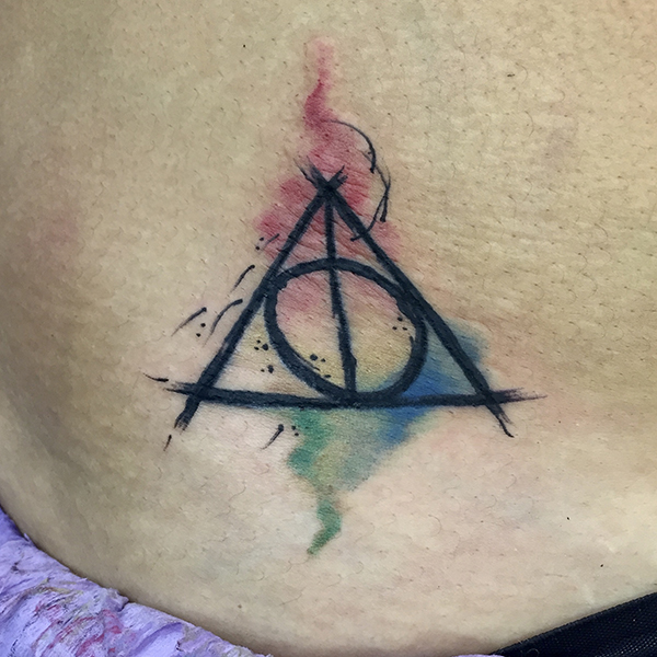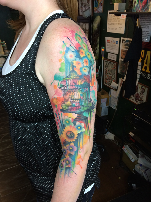 Dust bunnies, Ghibli tattoo鳥かごと花、ウォーターカラースタイル、フリーハンド