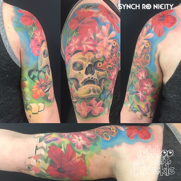 Skull, tropical flowers and butterflys, Realistick style on half sleeveスペースタトゥー、カバーアップ