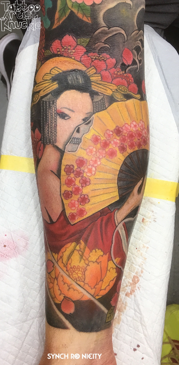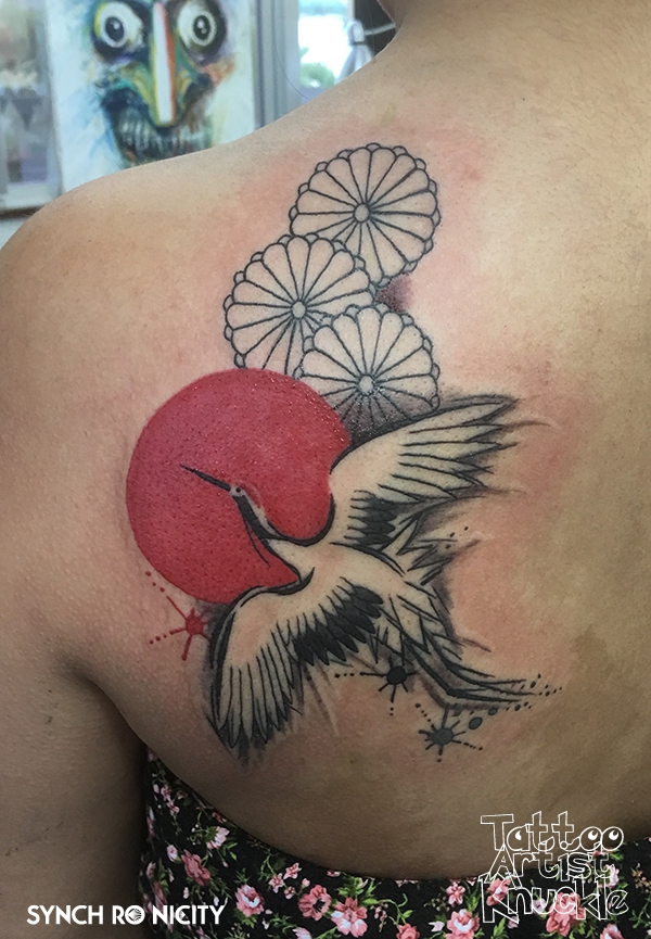 Geisha tattoo, on forarm鶴と日の丸と菊花紋章、