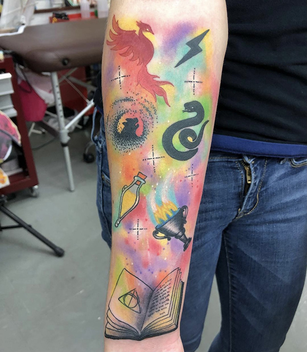 Harry Potter items, watercolor backgroundリアリスティックスタイルの花々のハーフスリーブ
