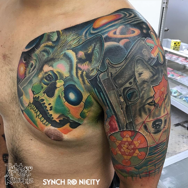 Astronaut and watercolor style狼と頭蓋骨と拳銃と宇宙と幾何学模様