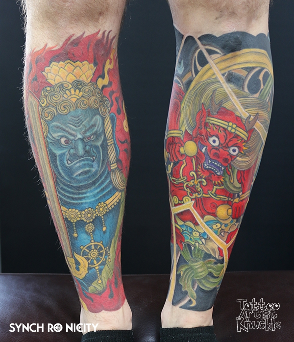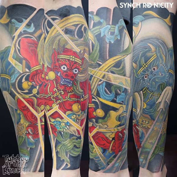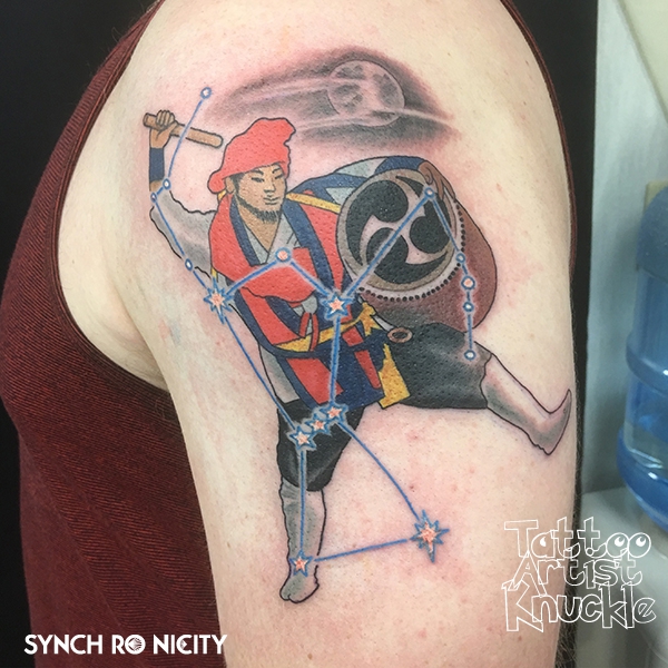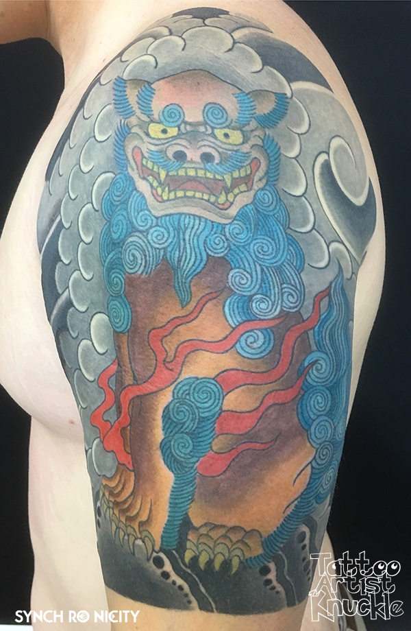 Shi-sa tattoo, Japanese style on half sleeveエイサーダンサーとオリオン座
