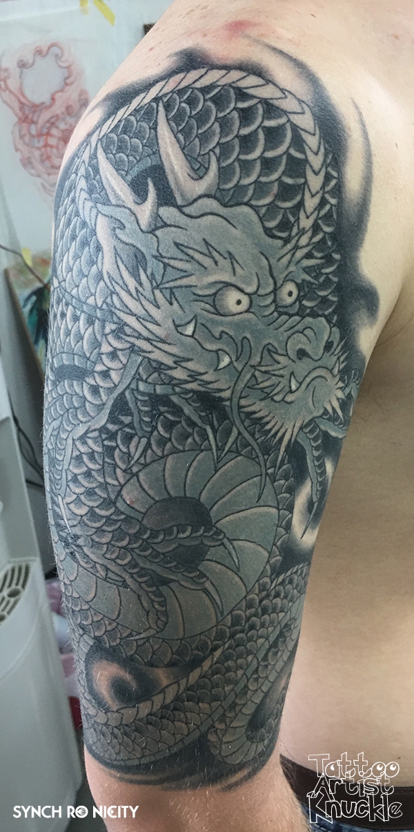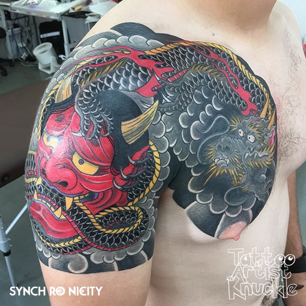 Hannya mask and black dragon宇宙タトゥー、フルスリーブ、リアリスティックと3Dスタイル
